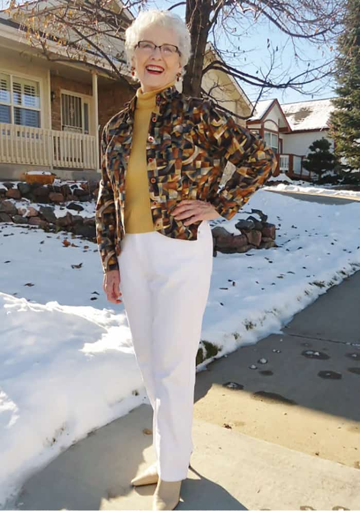 I think white jeans can pop any other color that you wear with it. Take for example my post seen here! For this example, I tried to vary the kinds of colors that we paired with our white jeans. The 50s model (me) wore a bright colored top. The 60s model (my stepmom) wore a more muted color tunic and the 70s model (my mom) wore a dark sweater.