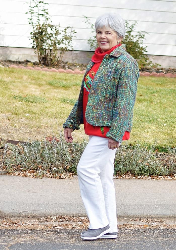 Now in comparison, if we had worn our blue jeans or dark trousers with these same tops, the look would be overall more subdued. And perhaps, that’s your goal when you get dressed in the mornings. Maybe you don’t want to stand out and get attention?